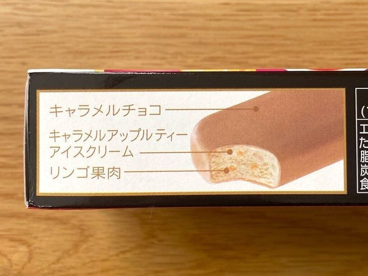 リンゴ果肉入りのキャラメルアップルティーアイスが、キャラメルチョコレートで薄くコーティングされています。バータイプのアイスの中ではやや小さめサイズです。