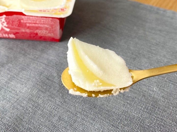 口に入れた瞬間は微細氷のシャリっと食感を楽しめ、すぐにスーッと溶けていきます。アイスが溶けると同時にりんごの風味と甘酸っぱさが口いっぱいにひろがり爽やか。
