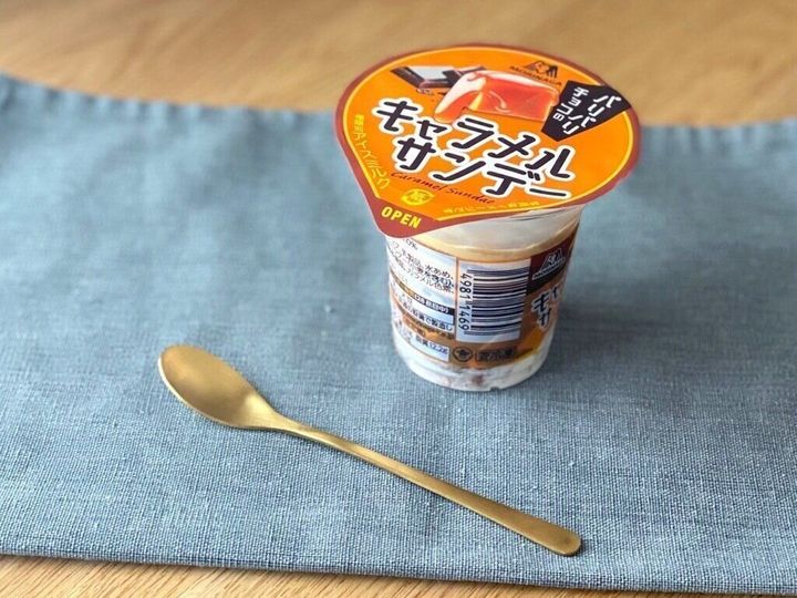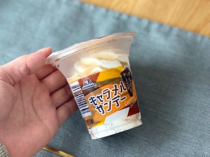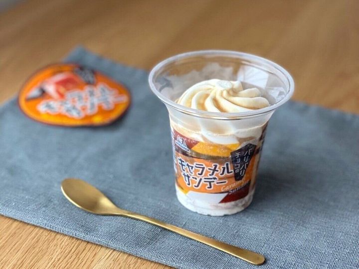 チョコレートが入ったキャラメルアイスの上にミルクアイス、トップにキャラメルソースがかかったパフェタイプのアイスです。