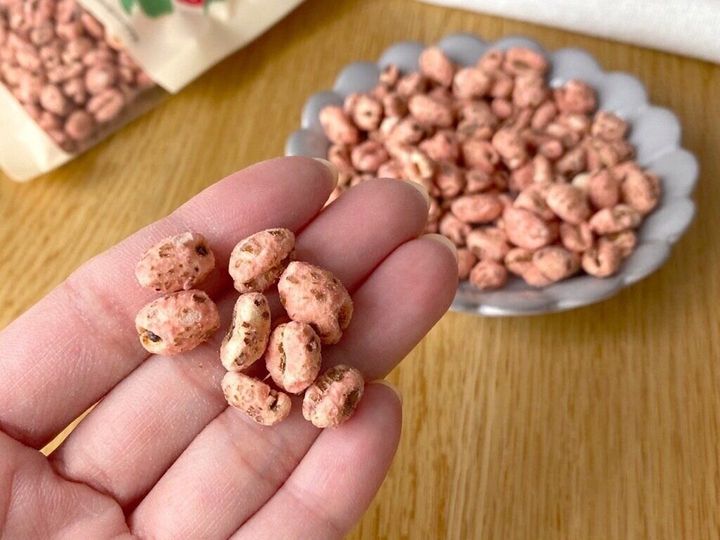 いちごパウダーがしっかりとまぶされていますが、いちごの香りはほんのり感じる程度。口に入れるとサクサク、ふわふわと軽い食感の後に素朴で優しい甘さがひろがります。ほんのり香るいちごフレーバーと麦の香ばしさは相性がよく、水あめの程よい甘さがクセになり手が止まりません。