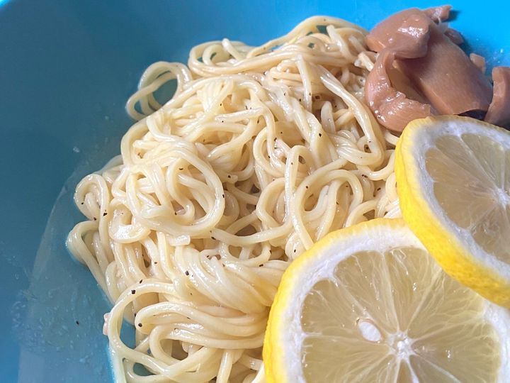 口に入った瞬間はレモンの香りと酸味を強く感じますが、チキンの旨みとにんにくの香りがきいているので後味はまやかな酸味に。胡椒のピリ辛さが程よくアクセントになっていて、全体的にさっぱりと食べやすい味わいです。麺はコシがありながらも歯切れのよいタイプで食べ応えも抜群。