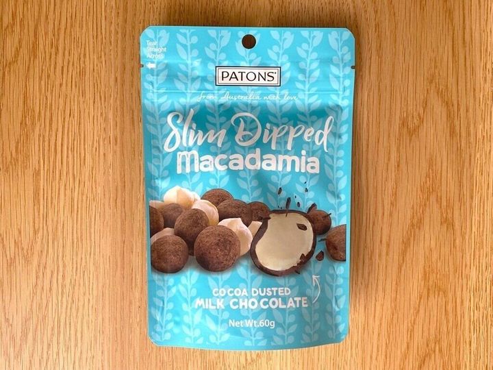 こちらもカルディのお菓子コーナーで販売されている「スリムディップマカダミアチョコレート」。香ばしくローストしたマカダミアナッツをミルクチョコレートで薄くコーティングしたチョコ菓子です。