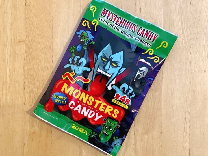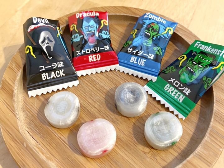 ストロベリー味はドラキュラの赤、メロン味はフランケンの緑、コーラ味はデビルの黒、サイダー味はゾンビの青い舌になります。