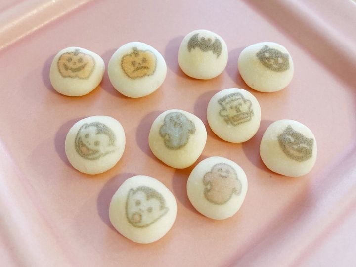 天然着色料でジャック・オー・ランタンなどハロウィンモチーフをプリントしたたまごボーロ。