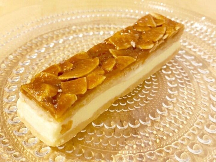 スライスアーモンドに生キャラメルをかけ、低温で香ばしく仕上げたフロランタンに、しっとり口どけのよいレアチーズを組み合わせたスイーツ。