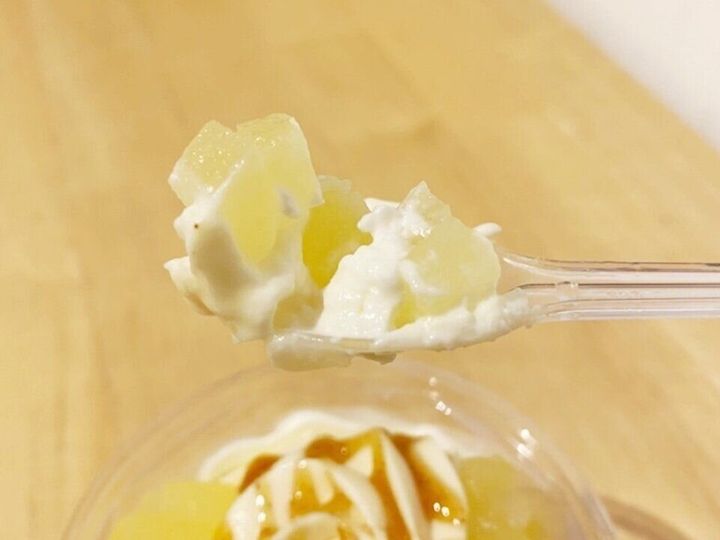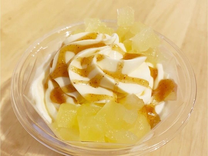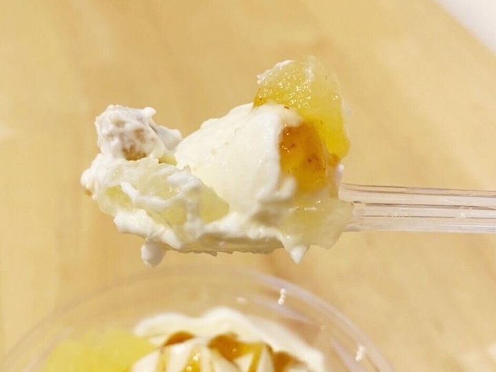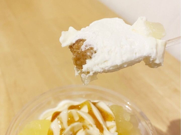 最上部にトッピングされたりんご果肉はシャキシャキ食感で上品な甘さです。なめらかな舌ざわりでチーズの味が濃厚なチーズホイップと、シナモンの風味豊かな甘いカラメルソースとの相性は抜群◎