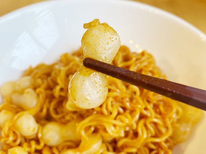 お湯を沸かさずに作れるのが魅力!甘さの後にヒリヒリとくる辛さがやみつきになります。歯切れのよい細麺とモチモチのトッポギの2つの食感を楽しめるのも嬉しいポイント!あっという間に手間なく作れるので小腹が空いた時用にストックしておきたいアイテムです。