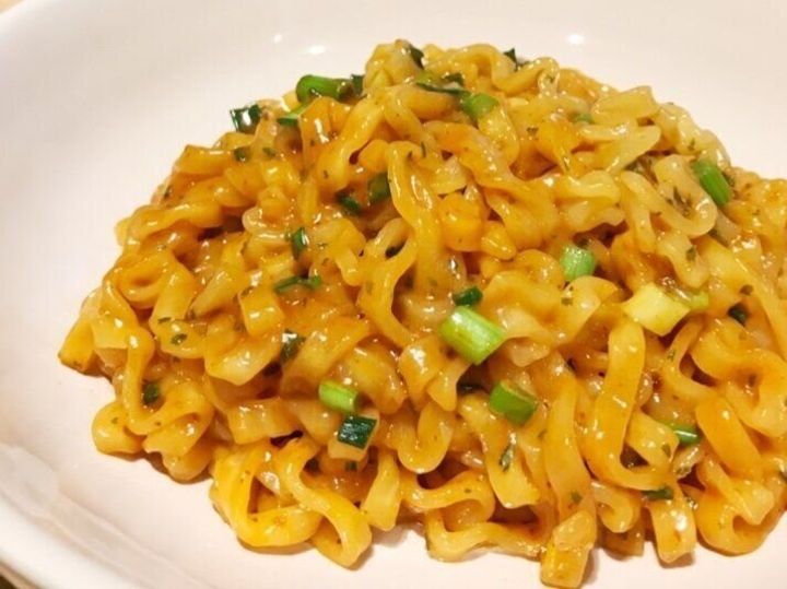 モチモチした食感が特徴の韓国ラーメンに、カルボナーラをイメージしたクリームの風味を加えた炒め麺。