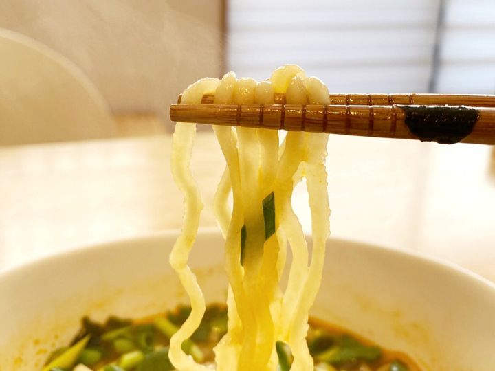 じゃがいもでん粉を練り込んで作ったモチモチ食感の麺とピリ辛スープを合わせたラーメン。