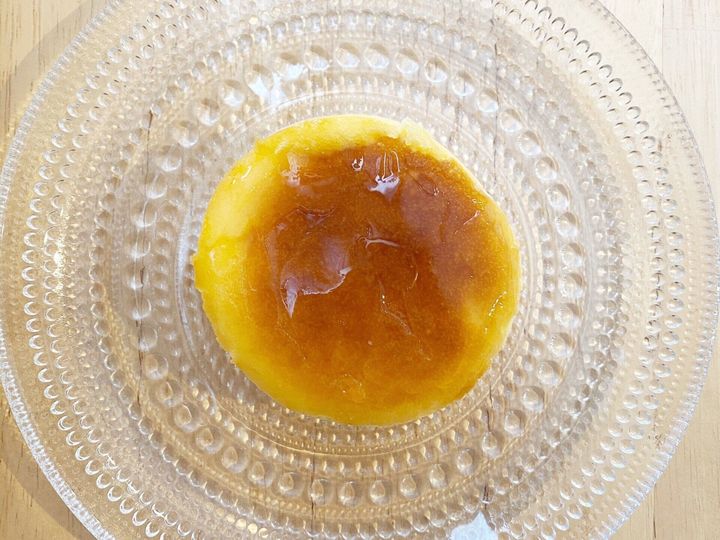 袋からだして持ち上げてみるとずっしりと重みを感じます。天面はあんずシロップでコーティングされていて、ビジュアルからは昔ながらのスフレチーズケーキの素朴さを感じます。