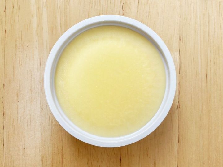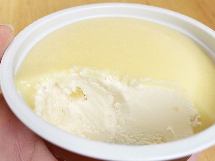 細かくカットされたりんご果肉入りの発酵バターアイスの上に、りんご風味の発酵バターソースがかかっています。上から見たビジュアルはまるでバター!