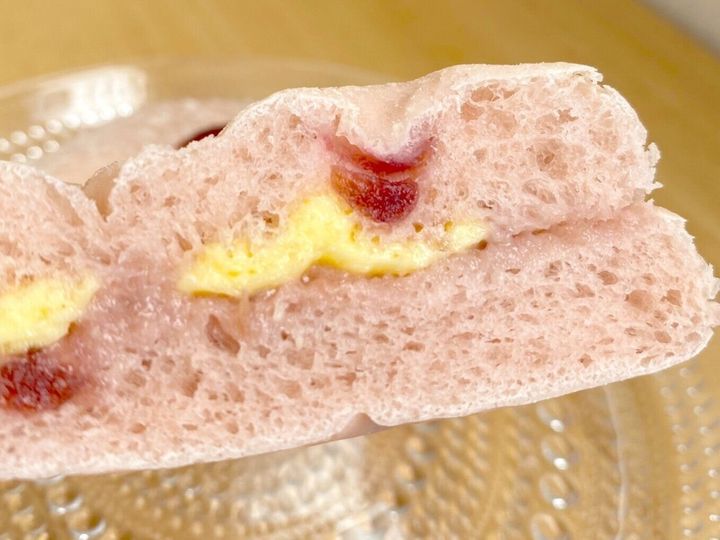 いちごと三温糖等を煮詰めたジャムにバターを加えたいちごクリームとバターを、いちご果汁入りシロップとクランベリーを練り込んだもっちり食感の生地でサンドしたフォカッチャ。価格は150円(税込)。