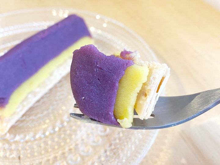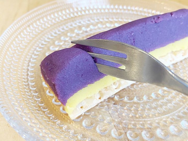 ワンハンドで食べられるパック入りですが、今回はお皿に出してみました。見るからになめらかな芋あんは、上はしっとりなめらかな口あたりの紫芋の蒸しいもあん、下はほくほくとした焼きいもあんの2種が使用されています。フォークを入れるとスーッと柔らかい芋あんを通り一気に下のパイ生地へ。パイ生地はフォークではカットすることがむずかしく、強引に押し切りするとパイがバラバラに(笑)やはりワンハンドで食べるのがオススメです!