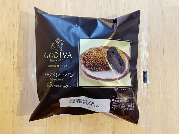 牛ひき肉とビーフエキスでうまみを出し、隠し味にチョコレートを使用したカレーをココア入りのチョコ生地で包んだ、GODIVA監修のカレーパン。313kcal、280円(税込)。