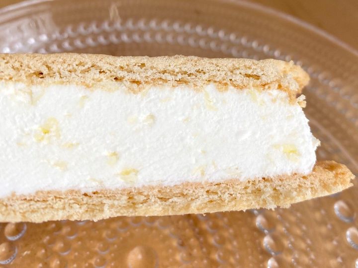 クッキー部分は白い恋人のラングドシャが表現されているそうですが、ラングドシャのサクサク食感とは別物。しっとりホロホロと崩れて、小麦の風味を感じられる優しい甘さです。ホワイトチョコレート風アイスは甘すぎずミルキーな味わいで、たまにやってくるチョコレートチップの食感がアクセントになっています。口の中で広がるバターとホワイトチョコレートの風味は白い恋人さながらの味わいになっています。