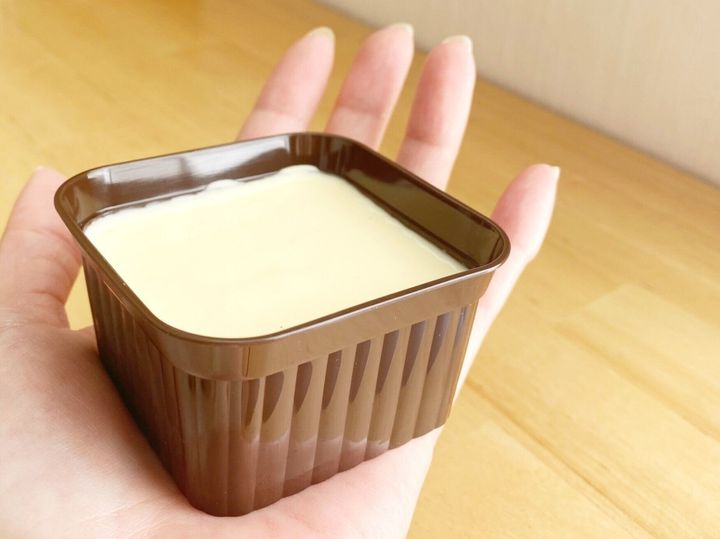 手のひらにちょこんと乗るほどのサイズで、コンビニのカップスイーツとしてはやや小さめのサイズ感です。