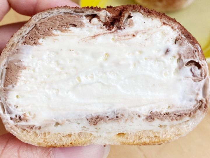 触るとふにゃ〜と柔らかいシュー生地の表面にはココアパウダーがまぶされています。ふわっと香るココアが、食べる前から期待度を上げてくれます。