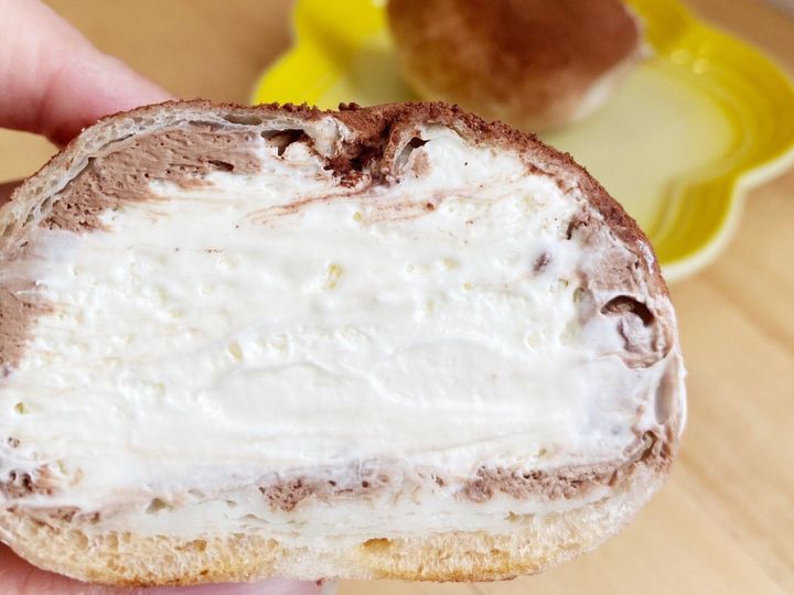 乳脂肪分が高いだけあって、生クリームはコクがありミルク感をしっかりと感じられます。濃厚なチョコレートクリームと混ざり合い、口の中がクリームに占領されて幸せ〜!もっちりとした生地とビターなココアパウダーは絶妙な存在感でクリームの引き立て役になっています。