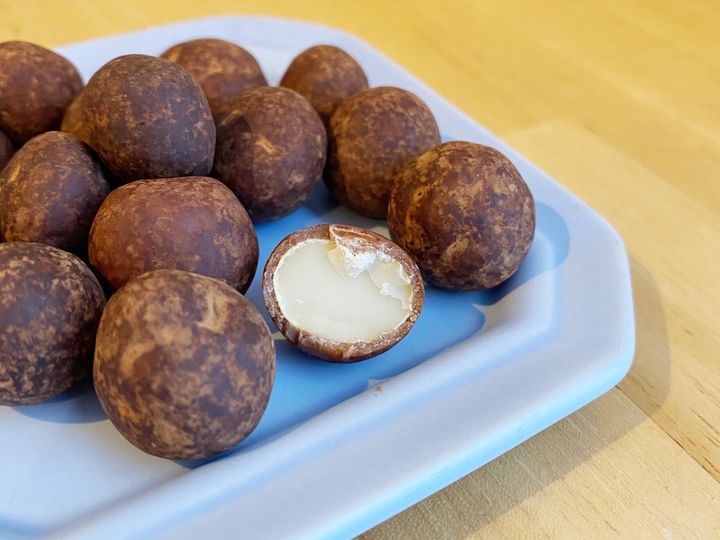 一般的なマカダミアチョコレートよりもコーティングのチョコレートが薄いですが、これが絶妙なバランスになっています。マカダミアナッツの香ばしさに甘いチョコレート、ほろ苦いココアパウダーは相性抜群!マカダミアナッツのカリカリとした食感もやみつきになります。