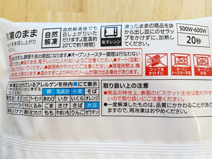 買ってきた翌日に冷凍庫から出して、「さぁ、食べましょう!」とパッケージをよく見ると、【そのまま食べる】【常温で1時間待つ】【電子レンジで温める】の3つの方法が記載されていました。