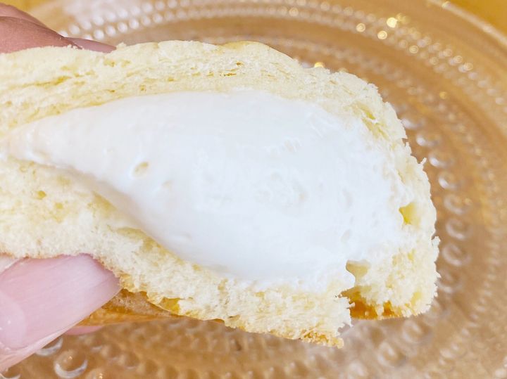 パン生地もクリームも心地よい冷たさで、全体的にかための食感です。生地が思いのほかしっとりしていて舌の上で溶けていくクリームと混ざり合いおいしいです。パンと言うよりはスイーツに近い印象です。