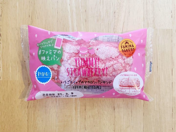 デニッシュ生地にいちご味のマカロン生地をのせて焼き上げ、いちごホイップとイチゴジャム、いちごのフリーズドライをサンド。見た目も春らしい“いちごづくし”の菓子パンです。425kcal、150円(税込)。