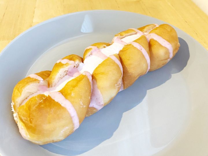 素朴な味わいのドーナツ生地、酸味のあるクリーム、甘いイチゴチョコレートの3味が混ざり合うことで、実力を発揮するといった印象のドーナツです。