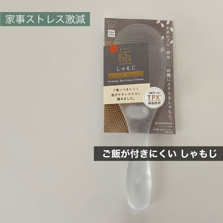 あまりに使いづらいので、SNSで話題になっているMARNAの「極 しゃもじ プレミアム」を試しに購入したところ、本当にお米がつきづらくてびっくり!