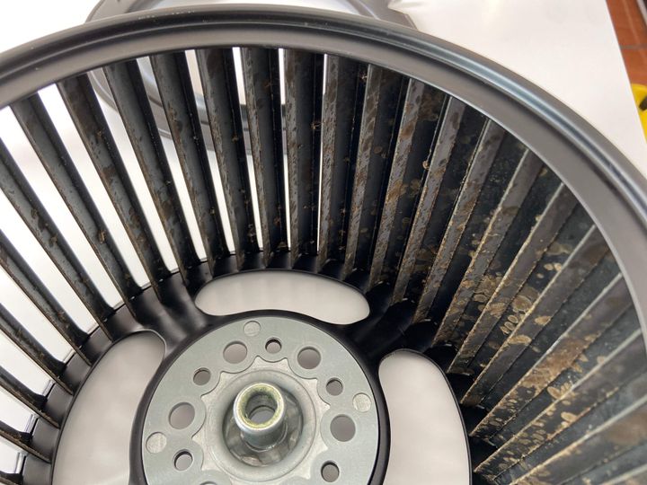 下から換気扇を見上げる分にはあまり汚れていないように見えたシロッコファン。ですが、いざ取り出してみると謎の焦げ付き汚れがびっしり!