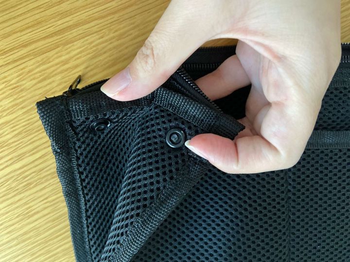 このバックインバックのポイントが、バックの横についたスナップボタン!こちらで調整することによって真ん中の仕切りを大きくガバッと開くことができ、物の量が増えてしまったときにも対応することが出来ます。