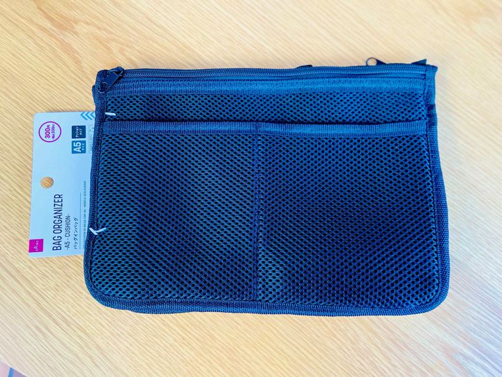 今回購入したのは「A5」サイズで小さいポケットが4つ、中くらいのポケット4つ、ファスナー付きの仕切りが2つ付いたものです。これで300円商品はお買い得ですね。