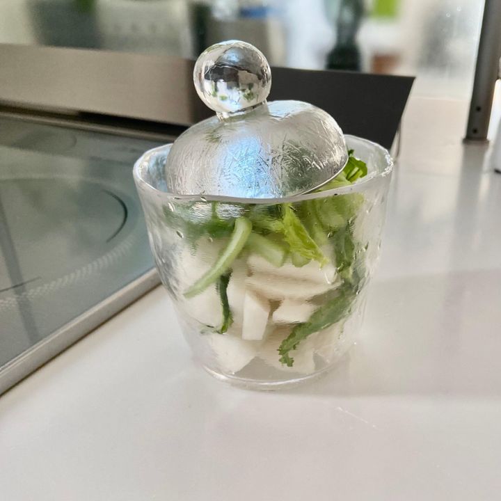 サイズは約380㎖で330円と、約680㎖で550円の2種類。家族が多く、漬物の消費量が多い方は大きいサイズがいいかもしれません。ガラスの鉢なので、食卓にそのまま出すことも出来ますし、そこまで高さも無いので、冷蔵庫に入れていても邪魔になりません。