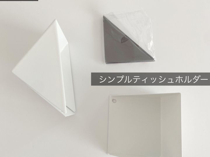 形は三角形でティシュボックスを挟んで使用するティッシュペーパーホルダー。お値段は220円(税込)でカラーはホワイトとブラックがありました。