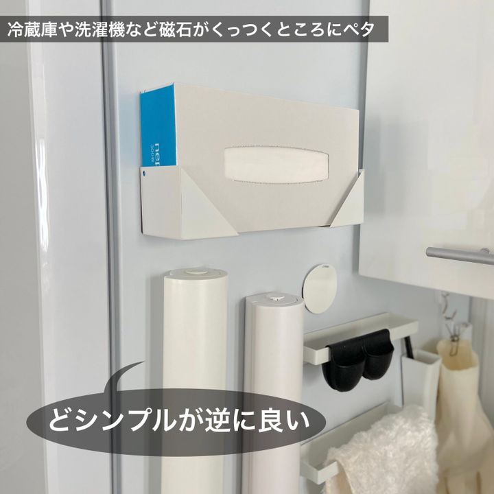 そんな時はこちらのアイテムを使用すれば、冷蔵庫横や洗濯機などに張り付けて、あっという間にティッシュの収納スペースが誕生です。