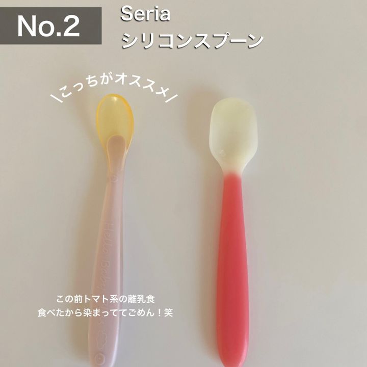 セリアの離乳食用のスプーンは何種類かあるのですが、私のおすすめは画像左側のスプーン。