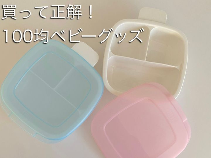 こちらはダイソーで販売されている、離乳食用のタッパー。パステルカラーの蓋がかわいらしいですね。仕切りがついていて3種類の離乳食がまとめて入れられるので、これ一つにおかゆや副菜を盛り付けすることが出来ます。