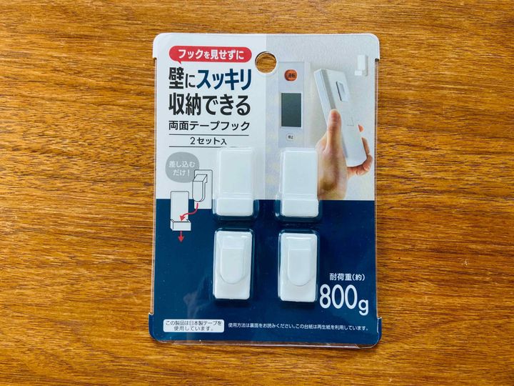 セリアのフックコーナーをふらふら~と歩いていると、見つけたのはこちらのフック。両面テープ式で、2つセットになっています。