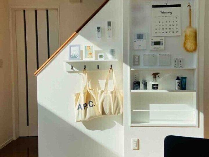またウォールシェルフを生かしたカバン置き場なので、棚へ物を飾ることが出来てインテリアのオシャレ度もぐっと上がるかと思います。