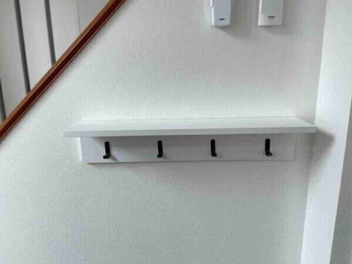 まずウォールシェルフに等間隔で、フックをねじで固定していきます。このとき両端のフックはあまり端に付けすぎないようにして、定規でしっかり間隔を測ると見栄えが良くなります。