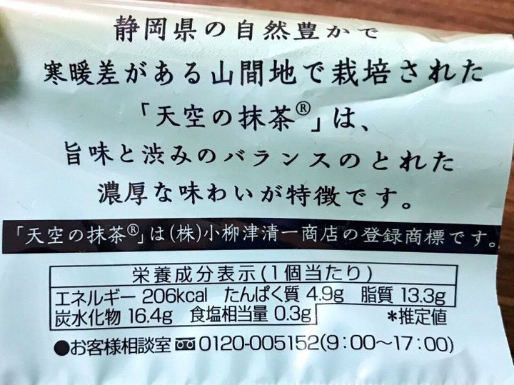 向かって右の方に、静岡県産「天空の抹茶(R)」使用と記載されています。
