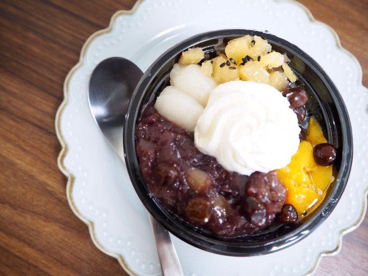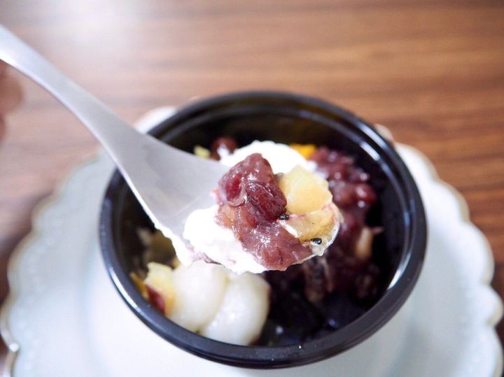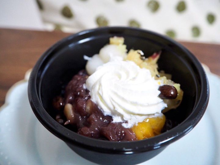 そのまま食べてしまいそうな見た目ですがカップが二層になっており、あんみつに黒蜜をかけ、さらに上から具材をのせる方式です。