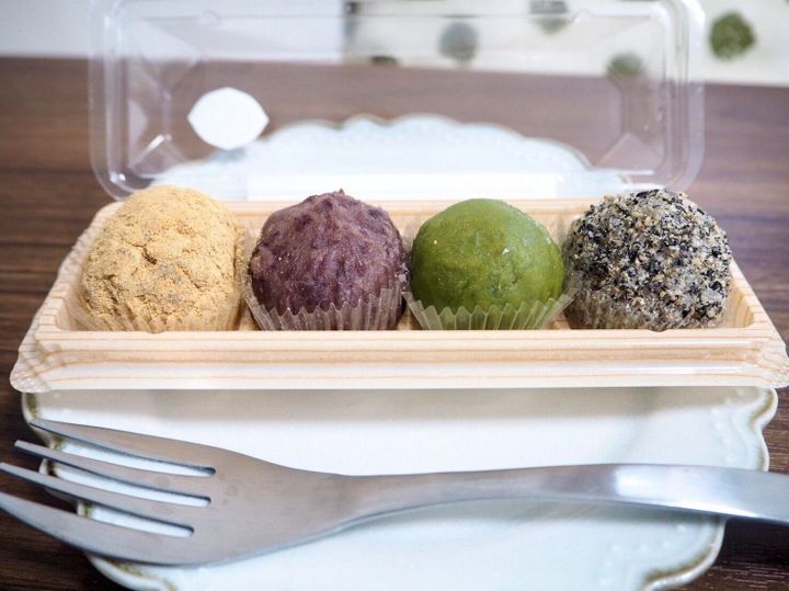 ひとくちサイズのかわいらしい4種類(きなこ、あずき、うぐいす、胡麻)のおはぎにはもち米ともち麦がブレンドされており、噛むごとにぷちぷちとしたもち麦特有の食感を楽しめます。