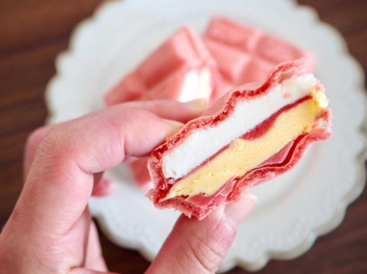 開封してみると、中からはかわいらしいピンク色のモナカがお目見えです。