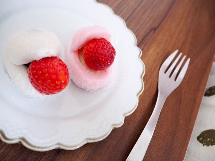 大福生地がピンク色のほうが、特撰 紅ほっぺ種の大きな苺大福 ミルク餡
