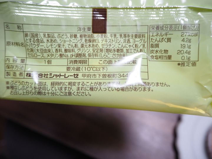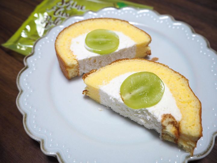 いただいた感想は、シャトレーゼこだわりのふわふわスポンジがふわっ、しゅわっと口当たりが良いのに加え、レアチーズクリームがとっても美味しい!酸味と甘味のしっかりしたシャインマスカットとこのクリームがよく合います。