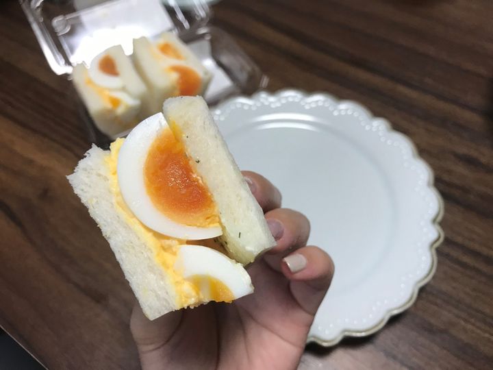 卵サンドというと、ペースト状の卵が食パンに挟まっているものをよく見かけますが、こんな風にごろごろとゆで卵が入っているのが斬新です。