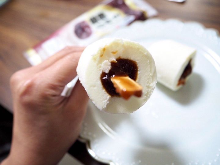 アイスの部分と真ん中の餡の部分が1:1くらい。ミルク×あずきカラーの見た目から饅頭感が漂います。