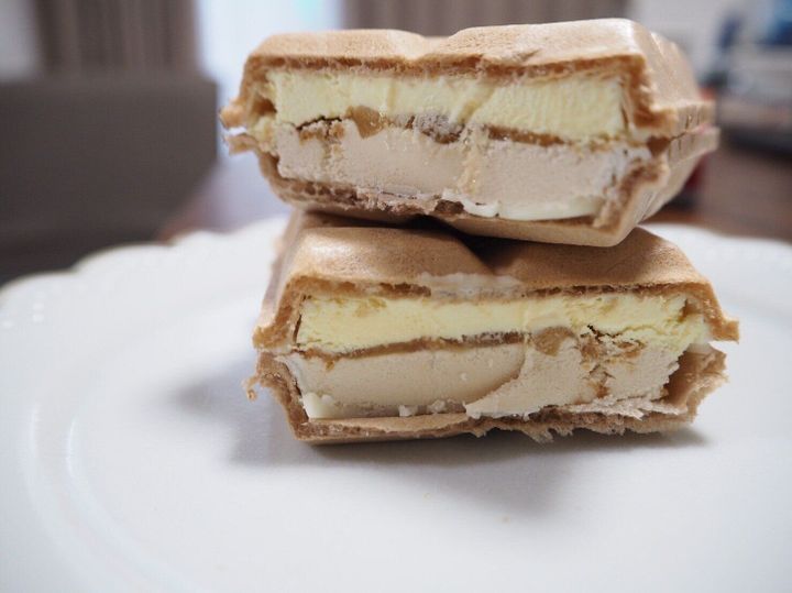 モナカの上下でアイスの種類が違う、真ん中にはとろーりクリーム、モナカ生地の近くには薄い板チョコが仕込まれているなど、こだわりの詰まったまさにデザートな贅沢アイスです。