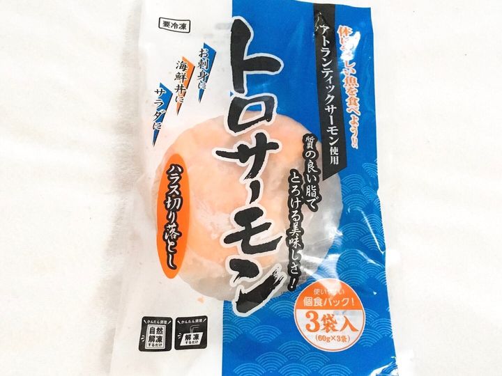 業務スーパーのベトナム産「トロサーモン」は、180g入り298円(税別)です。3袋の個食パックになっているので、1袋あたり約100円とコスパ抜群!自然解凍するだけで食べられるという手軽さも人気の秘訣です。