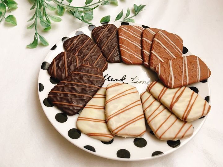 袋を開けると、パッケージ通りのビスケットが出てきました。見た目も可愛くてテンションが上がりますね!「ビターチョコ」「ミルクチョコ」「ホワイトチョコ」でコーティングされたビスケットが各4枚ずつ、全部で12枚入っていました。